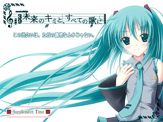 "Mirai no Kimi to, Subete no Uta ni" to gra z gatunku kinetic novel, chyba pierwsza tutaj recenzowana tego typu. Kinetic novel różnią się od visual novel tym, że nie ma w nich pytań, odpowiedzi i ścieżek, są w 100% liniowe. Sam średnio lubię takie tytuły i rzadko po nie sięgam, ale ten zwrócił moją uwagę. Przede wszystkim sprawiła to oprawa graficzna i dźwiękowa. Projekty postaci (z wykorzystaniem Hatsune Miku z "Vocaloid") są świetne, w grze występują też obrazki. Muzyczka w tle też jest miła. "Mirai no Kimi to, Subete no Uta ni" ma granicę więkową +15, nie ma w niej seksu, ale jest trochę ecchi.